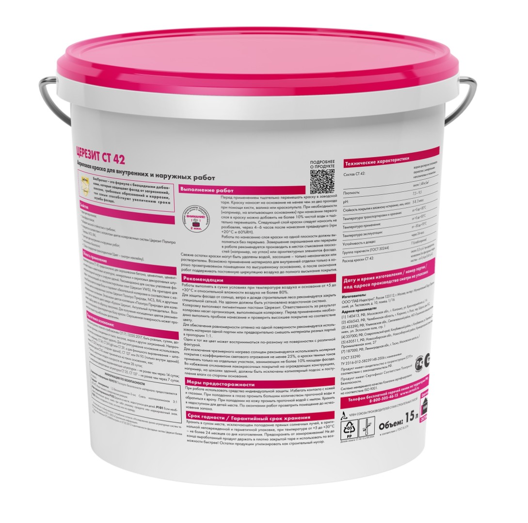 Описание товара: "Краска акриловая Ceresit СТ 42 водно-дисперсионная транспарентная база (15 л)"