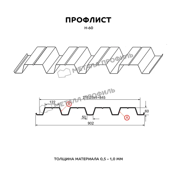 Профлист МЕТАЛЛ ПРОФИЛЬ Н-60x845-A (PURMAN-20-5005-0,5) часто используется в Нижнем Новгороде для обустройства профилированного листа. Представляет собой стальной оцинкованный лист с покрытием. Толщина металла с оцинковкой и защитно-декоративным слоем — 0.5 мм.После проката на специальном оборудовании металл принимает волнообразный вид. Несущая способность такого листа на порядок выше плоского.